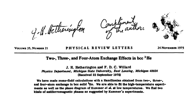 En noviembre de 1975, la muy prestigiosa revista científica “Physical Review Letters” publicó en su número 35 un artículo titulado “Two-, Three-, and Four-Atom Exchange Effects in bbc3He”, título que no nos atrevemos a traducir debido a nuestros limitadísimos conocimientos de física, donde se explicaba detalladamente el comportamiento de los átomos a diferentes temperaturas. El artículo, que en años posteriores sería citado en numerosas ocasiones – concretamente ciento siete veces hasta el año 2022 –, estaba firmado por Jack H. Hetherington y F.D.C. Willard, dos profesores de Física de la Universidad Estatal de Michigan.