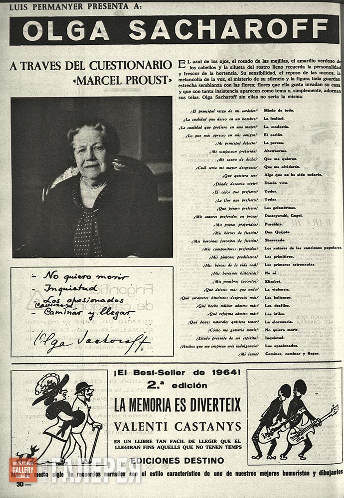 En 1964, a los 83 años, tres antes de su muerte, Olga Sacharoff contestó al “Cuestionario de Proust” que le hizo el joven periodista Luis Permanyer para la revista “Destino”. Este juego inglés se puso de moda en 1860 entre chicas adolescentes. Se llama así porque Marcel Proust contestó a uno mucho antes de ser famoso. Las preguntas siempre son las mismas y, desgraciadamente, no incluyen a los gatos.