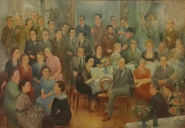 La II Guerra Mundial acabó, pero Olga Sacharoff ya no volvió a irse de Barcelona, quizá porque sabía que el París que conocía había desaparecido para siempre. O también porque había cumplido los 65 años y tenía muchos amigos en Barcelona que consideraban su casa en el barrio del Putxet “un auténtico oasis”. Cuentan que preparaba galletas y bollos para los hijos de sus amigos. En 1947 pintó el monumental “La colla”, con todos sus amigos pintores e intelectuales y sus esposas en primer término a la izquierda. Están los hermanos Llimona, Monpou y Amat, Vila Arrufat, Llorens Artigas, Enric Monjo, Tomàs Seix y Luis Monreal, entre otros.
