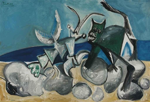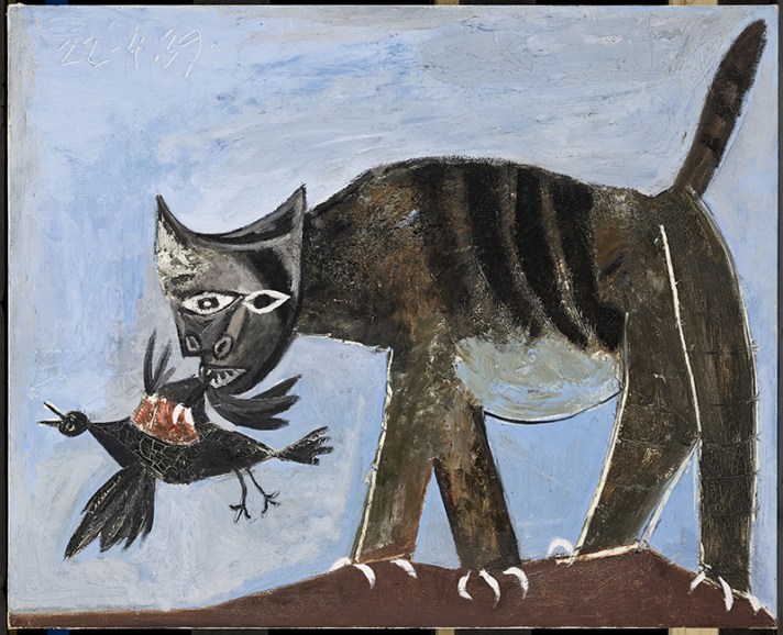 En abril de 1939, Picasso pinta los famosos “Gato atrapando a un pájaro” y “Gato devorando a un pájaro”, cuadro en el que muchos críticos ven un simbolismo bélico. Acaba de terminar la Guerra Civil en España, y Alemania estaba a punto de invadir Bélgica y Francia. Unos años después, durante la ocupación nazi, Picasso le dice al fotógrafo Brassaï: “Me gustan los gatos salvajes de pelo erizado… Cazan pájaros, vagan de aquí para allá, corren por la calle como demonios… Nos lanzan miradas ariscas, dispuestos a atacarnos… ¿Se ha fijado que las gatas callejeras siempre están preñadas?” Una opinión bastante romántica del gato callejero que se busca la vida.