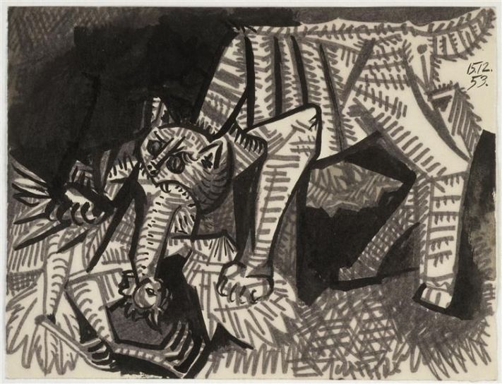 Ya no volverá a dibujar a un gato – excepto algún estudio que otro – hasta los años cincuenta, concretamente el 15 de diciembre de 1953, con “Gato devorando a un gallo”, regresando al mismo motivo de 1939.