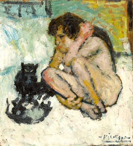De la época que residió en la capital catalana, entre 1895 y 1900, hemos encontrado dos cuadros de mujeres con gatos. En uno, la mujer está acostada y acaricia a un gato blanco y negro; en el otro, la mujer está desnuda, sentada en el suelo, observando a dos gatos negros jugando. Picasso estaba a punto de entrar en el periodo azul, que corresponde a los años 1901-1904, originado por el suicidio de su amigo Carles Casagemas.