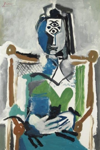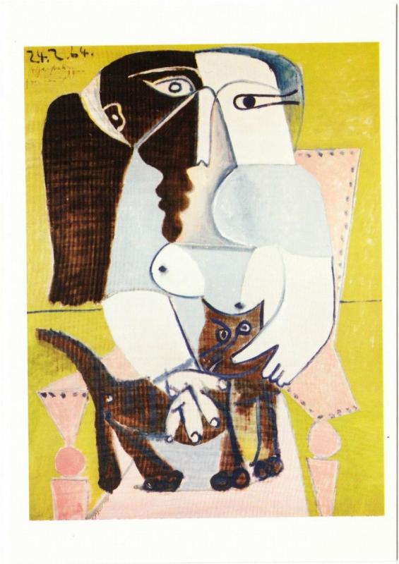 De pronto, a partir de 1964, los cuadros con gatos se multiplican; hay dos “Mujer desnuda con gato” y tres “Mujer sentada con gato”, por ejemplo. Como ocurrió con Dora Maar, los gatos son muy pequeños con relación al personaje humano, minúsculos incluso.