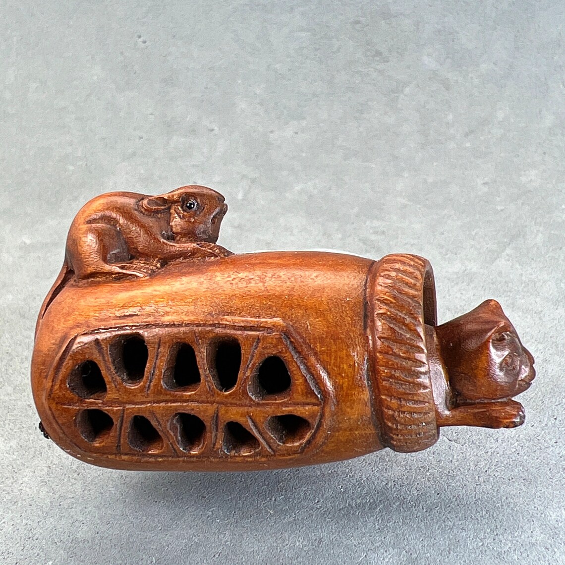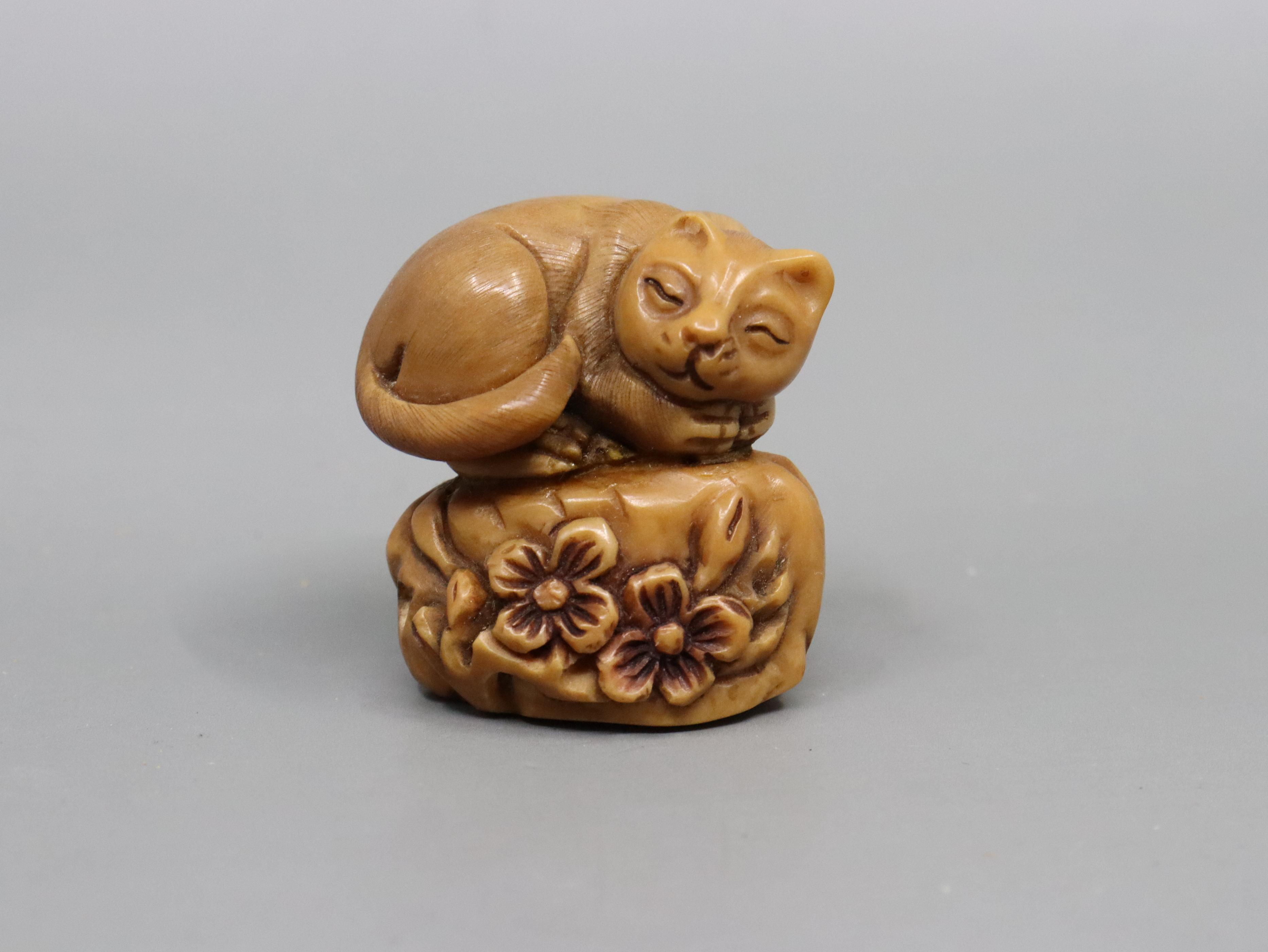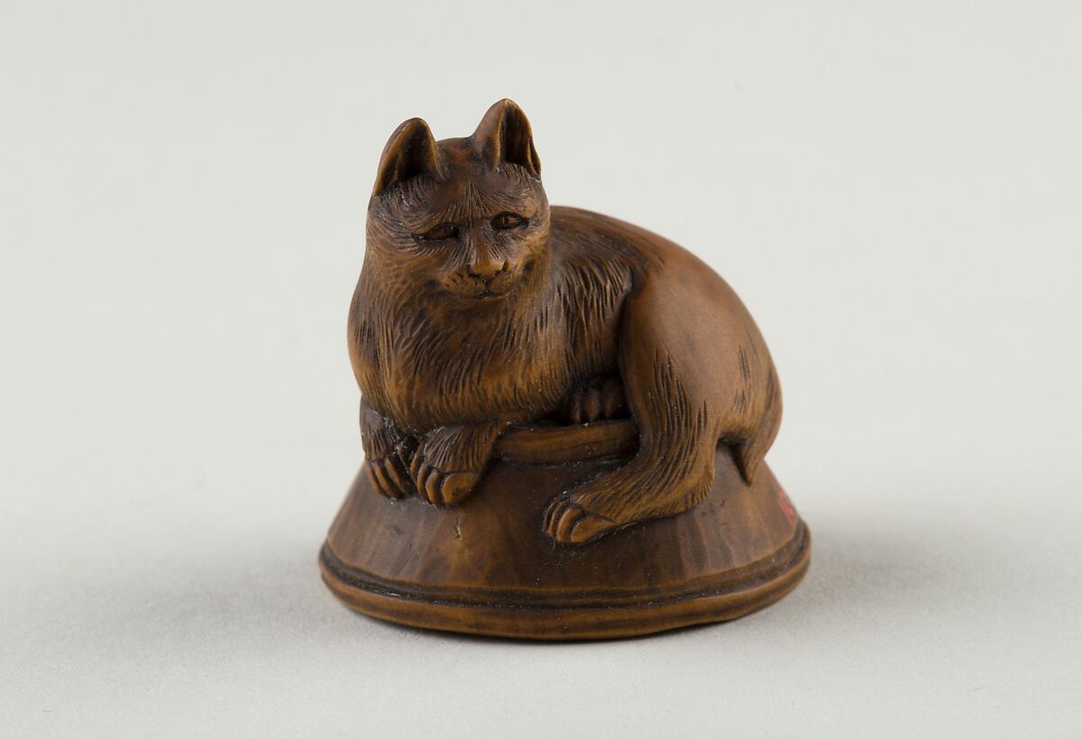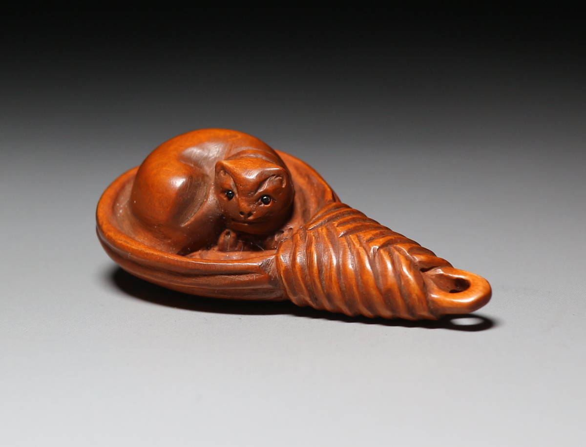 El gato (neko) no suele abundar en el arte de los netsuke, aunque sí hay alguno. Quizá debamos empezar a explicar lo que es un netsuke y cuál era su utilidad. Se trata de una escultura en miniatura que nace en Japón durante el siglo XVII. Al principio no era más que una especie de botón atado a las cuerdas de una pequeña caja inrō donde guardar cosas necesarias, que acabó convirtiéndose en una diminuta representación maravillosamente esculpida.