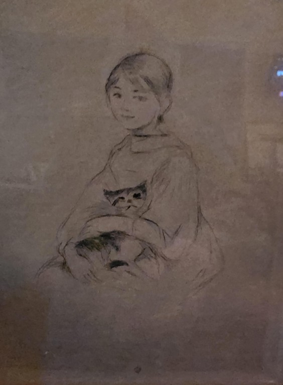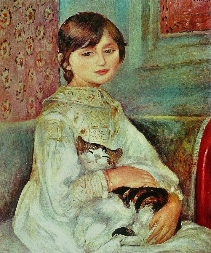 Los gatos no abundan entre los impresionistas, y Berthe Morisot solo les dedicó dos cuadros y un dibujo. El dibujo representa a su hija con un gato en el regazo y está fechado en 1888. Un año antes, en 1887, Pierre-Auguste Renoir (https://gatosyrespeto.org/2017/11/23/los-gatos-de-pierre-auguste-renoir/) pintó “Niña con gato o Julie Manet con gato”. El dibujo y el cuadro son idénticos, las dos modelos, la niña y la gata (porque es una gata tricolor), son las mismas. En 1887, Julie tenía 9 años. Ambas obras indican que la gata vivía en casa de Berthe Morisot.