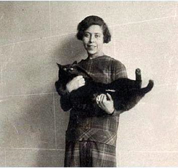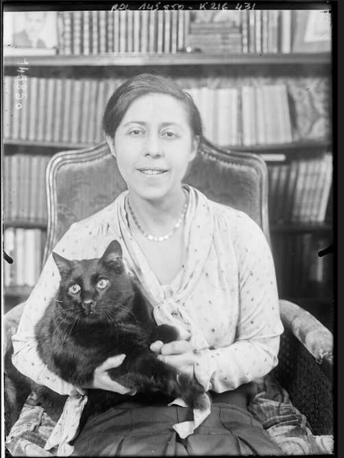 La primera foto de la escritora con un gato es de 1928. En las cuatro que hemos encontrado, siempre se ve a Kissou, un gato negro enorme al que tiene en brazos para la foto. En 1928 ya debe de tener unos tres años para haber alcanzado semejante tamaño. En la foto con sus hijas Denise, nacida en 1929, y Elisabeth, en 1937, Kissou tendría 15 o 16 años, ya que la niña pequeña parece tener algo menos de dos años.