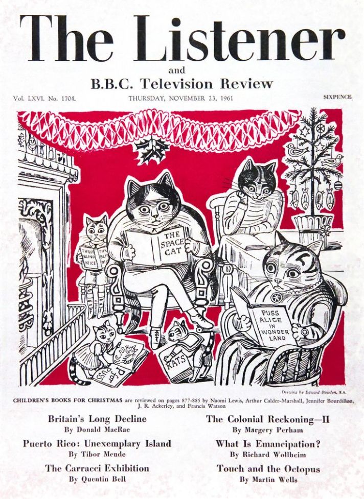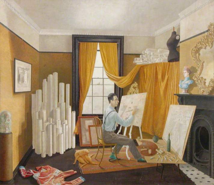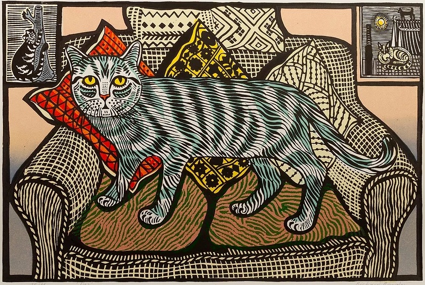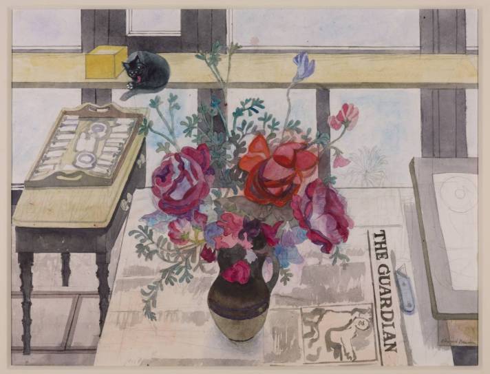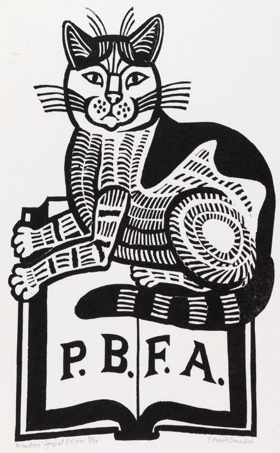 Edward Bawden dibujaba gatos antes de convivir con Emma Nelson, pero nunca había hecho tantos cuadros de gatos en tan poco tiempo desde que llegó ella. Sabemos que tuvo otros gatos gracias al retrato sobre madera realizado por su amigo Eric Ravilious en 1930. En él vemos a Bawden en su estudio, pintando, y a un gato rubio en la alfombra, lavándose. Queda claro que los gatos formaban parte de la vida de Bawden.