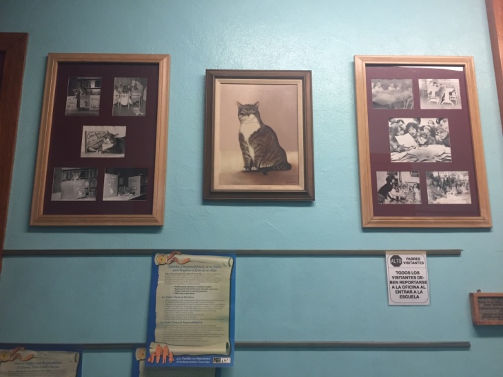 Un buen día de 1952 apareció un gato en el aula 8 de la escuela primaria “Elysian Heights” (Altos Elíseos) de Echo Park, un barrio en pleno centro de Los Ángeles conocido por ser el hogar de músicos, actores y directores de cine como Frank Zappa (https://gatosyrespeto.org/2018/02/22/gatos-el-maestro-y-frank-zappa/), Steve McQueen, Shia LaBeouf o John Huston, entre otros. En los años cincuenta, Echo Park aún no tenía su célebre zona de moda, ni tampoco estaba tan densamente poblado; actualmente cuenta con más de 43.000 habitantes.