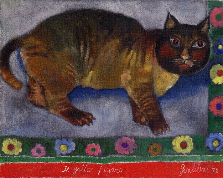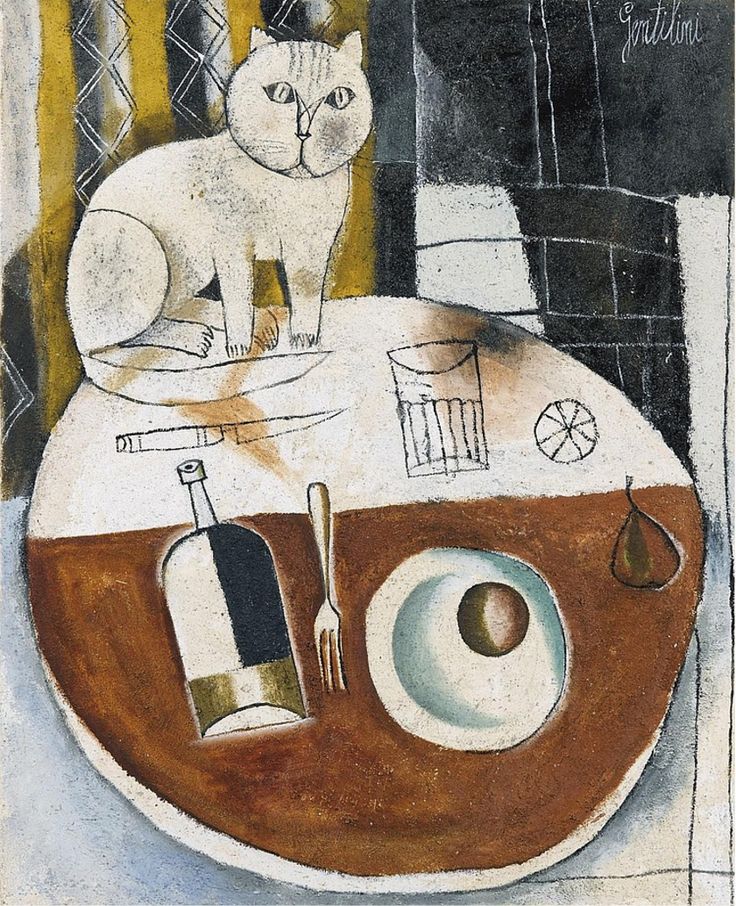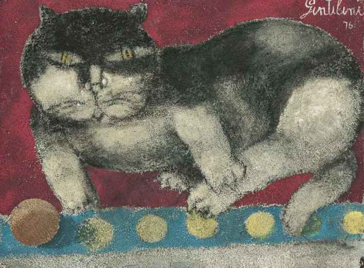 El estilo de Franco Gentilini cambió en los años inmediatamente posteriores a la Segunda Guerra Mundial hasta mediados de los cincuenta, inclinándose por el cubismo. Pintó catedrales y baptisterios geométricos, a malabaristas y otros profesionales itinerantes, paisajes irregulares, mujeres desnudas con tacones de aguja, bicicletas y camiones, gatos y leones. En general, sus composiciones de personajes son estáticas, todos están inmóviles, casi sin expresión. Ninguno de los gatos que dibujó o pintó son como el felino blanco de pelo largo que tiene en brazos en una foto. Al contrario, todos parecen gatos callejeros muy normales, redondos, gordos, bien alimentados.