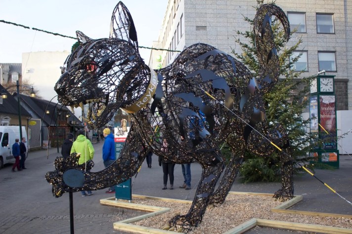 Ignoramos cómo acabó el debate, pero hemos descubierto otro gato de Navidad en la ciudad de Akureyri, totalmente al norte del país, en el fiordo Eyjafjörður. Parece estar hecho de metal, no de LED y, contrario a la tradición, tiene los ojos verdes. Los del verdadero Jólakötturinn son abrasadores y rojizos.