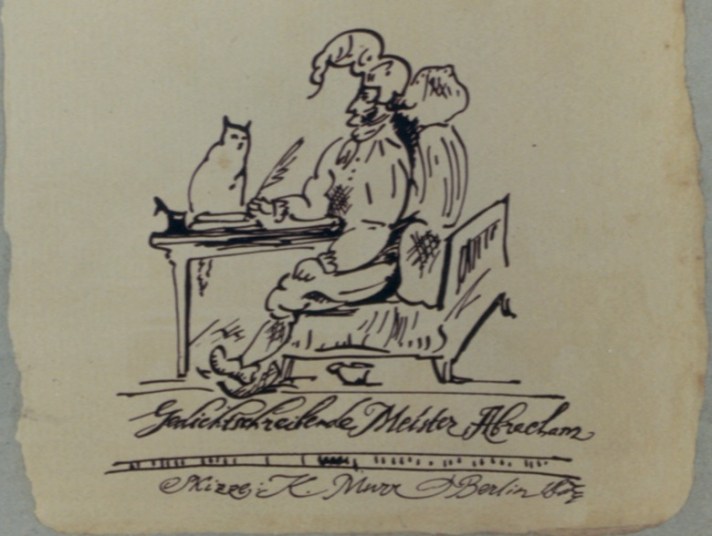 Volvamos al gato Murr. En la edición original alemana hay un dibujo del gato Murr, obra de Hoffmann, en la portada (reproducido en la edición inglesa de 1999). En mayo de 1820, Hoffmann escribió a su amigo el Dr. Friedrich Speyer: “Un gato auténtico al que había criado, un gato macho de gran belleza (su semblanza está bastante bien reproducida en la portada) y de aún mayor inteligencia, me dio pie para la divertida broma que se abre camino entre una obra muy seria”.