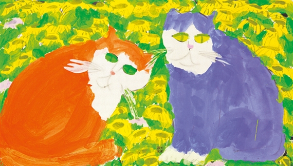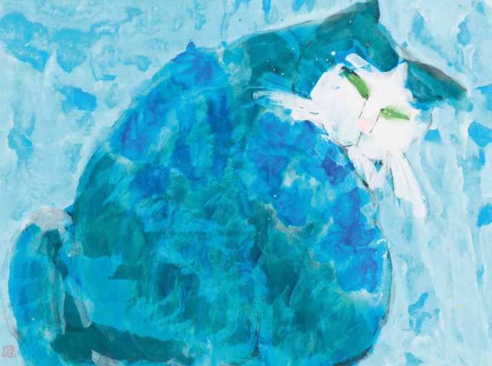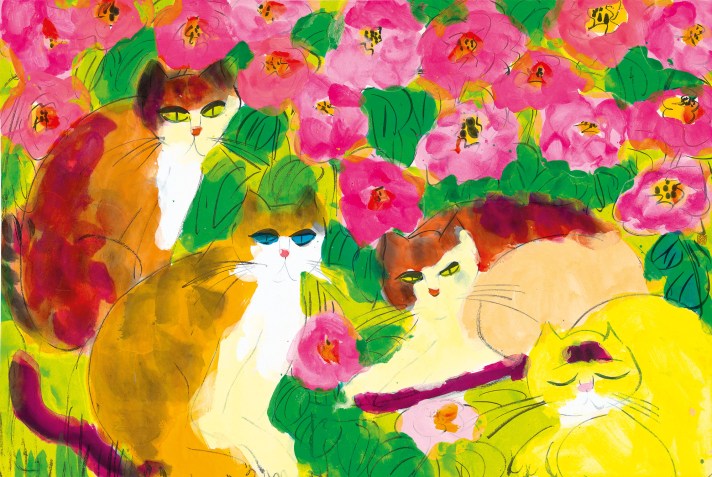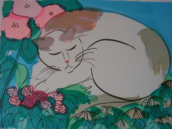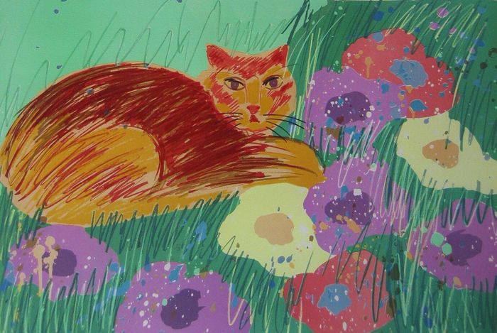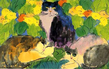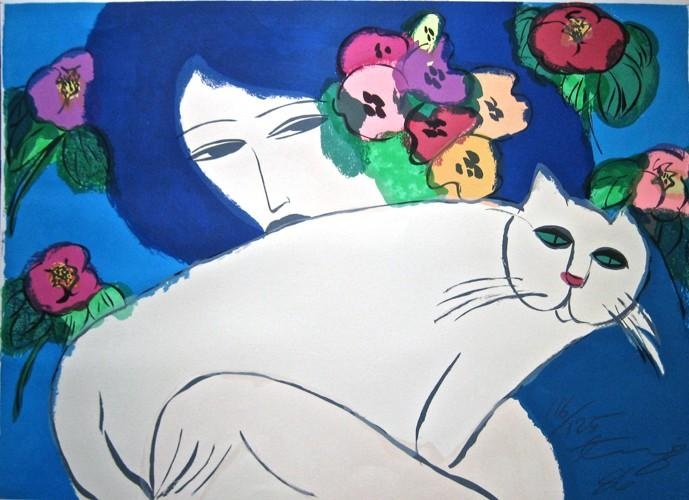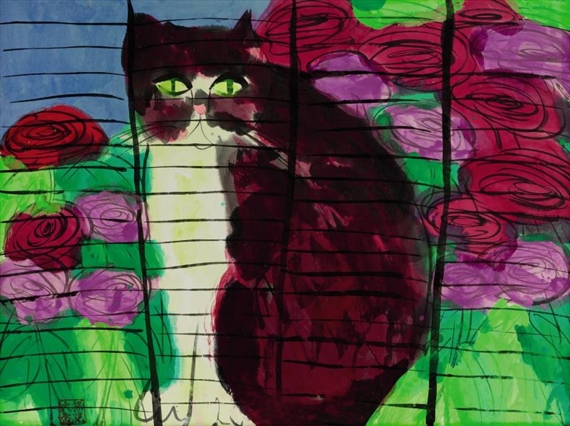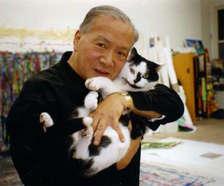En París había sobrevivido a duras penas, pero en Nueva York le fue mucho más fácil vender sus obras. Allí produjo una serie de cuadros abstractos de colores muy brillantes antes de inclinarse por un estilo más figurativo representando sobre todo a mujeres, flores y animales, y dentro de estos últimos especialmente gatos. Gatos con mujeres, gatos solos, gatos de dos en dos y de tres en tres, gatos rodeados de flores, gatos brillantes de todos los colores, gatos expresivos algo rechonchos que a pesar de ser azules, verdes, amarillos o rojos son auténticos gatos. Incluso sin ver la foto del pintor con su gato blanco y negro en brazos, sabríamos que Walasse Ting los amaba profundamente.
