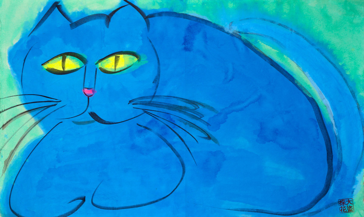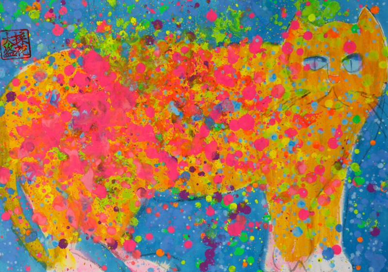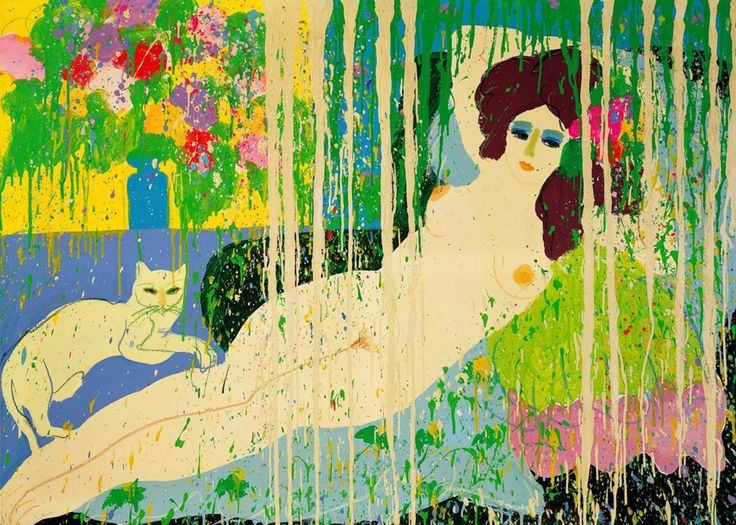 En París había sobrevivido a duras penas, pero en Nueva York le fue mucho más fácil vender sus obras. Allí produjo una serie de cuadros abstractos de colores muy brillantes antes de inclinarse por un estilo más figurativo representando sobre todo a mujeres, flores y animales, y dentro de estos últimos especialmente gatos. Gatos con mujeres, gatos solos, gatos de dos en dos y de tres en tres, gatos rodeados de flores, gatos brillantes de todos los colores, gatos expresivos algo rechonchos que a pesar de ser azules, verdes, amarillos o rojos son auténticos gatos. Incluso sin ver la foto del pintor con su gato blanco y negro en brazos, sabríamos que Walasse Ting los amaba profundamente.