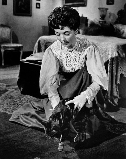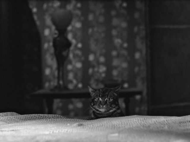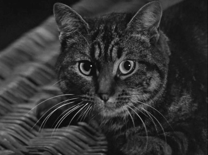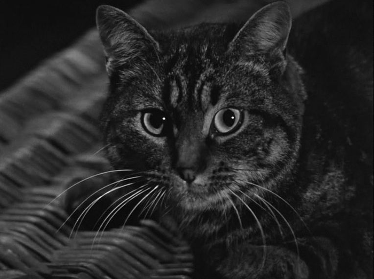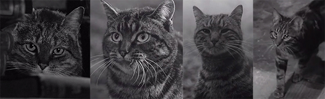 Como cualquiera puede ver por las fotos, Tabitha no tiene nada de horrenda, ni da miedo. Elisabeth, en la película, dice: “¿De verdad me están diciendo que una gata normal ha conseguido aterrar a tres adultos?” La criada Clara, un poco antes de caer por las escaleras, grita: “¡Es un demonio!” Y el marido Walter, desde su cama, concuerda: “¡Es mala, es mala!” Por mucho que se empeñen los “malos” de la película, Tabitha es una gata simpática. Pero además de simpática, es una excelente intérprete, como lo demuestra en algunas escenas bastante complicadas. El director John Gilling no consigue que Tabitha parezca amenazante, aunque escupa y arañe. No hemos sido capaces de saber si Tabitha fue interpretada por varios gatos parecidos, como suele ocurrir actualmente. Pero hoy, casi diez años después de la publicación de esta entrada, podemos asegurar que fueron los cuatro que vemos abajo.